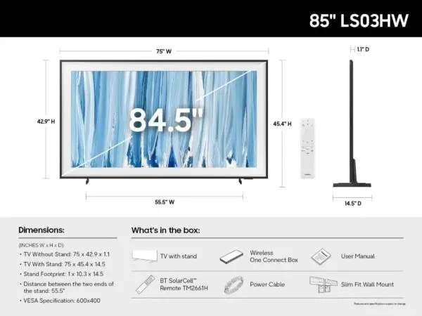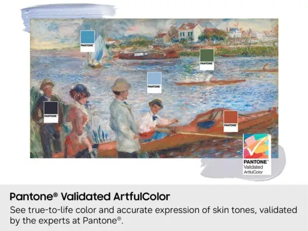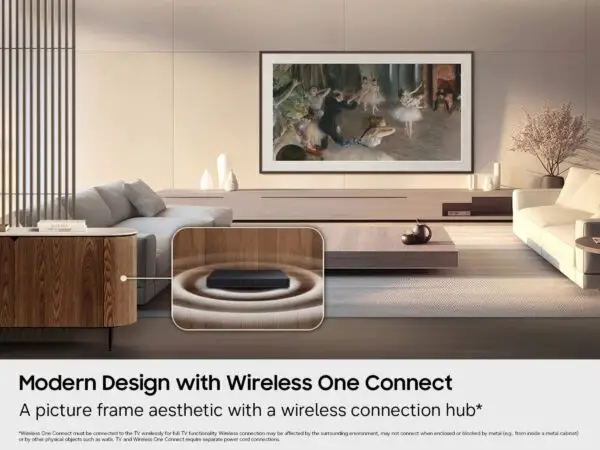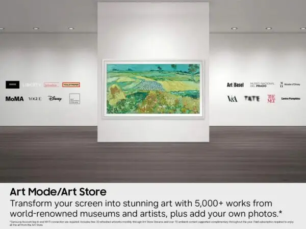 Our most advanced Art TV unlocks a collection of world-renowned artwork1 while the modern frame, matte screen and wireless connection2 create a true-to-life art viewing experience, free of clutter . Enjoy spectacular picture quality and sound, powered by Samsung Vision AI.3 With mini LEDs for precision lighting, our best Art TV picture delivers spectacular and immersive viewing. Enjoy your favorite shows without distracting reflections, allowing you to immerse yourself in the content—whether the sun is streaming through your windows or that one lamp is on while watching the latest thriller. Elevate any room with this stunning fusion of technology and artistry. Customizable bezels4 let you choose your style, while the revolutionary wireless connection hub2, allows for flexibility in mounting options, free from unsightly cords and clutter. When you’re not watching TV, The Frame transforms into art.5 Access a curated collection from the Art Store6 or upload your own photos.7 Finish the look with various mat styles and colors. Find the perfect piece of artwork from the world’s leading museums and artists such as The Met, MoMA, Salvador Dali, Keith Haring, Jean Michel Basquiat and more.1 Bigger screens mean bigger pixels. With groundbreaking enhancements exclusively on our largest screens, get improved clarity with dramatic contrast and reduced noise. Your content will look huge, sharp and clear — just like you want it.9